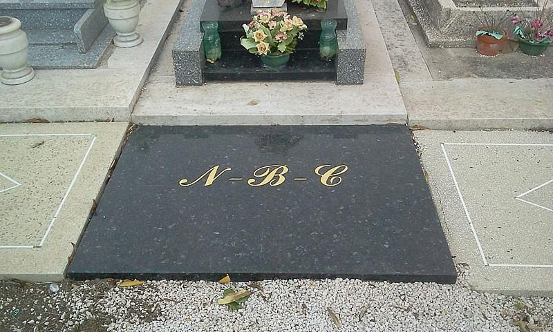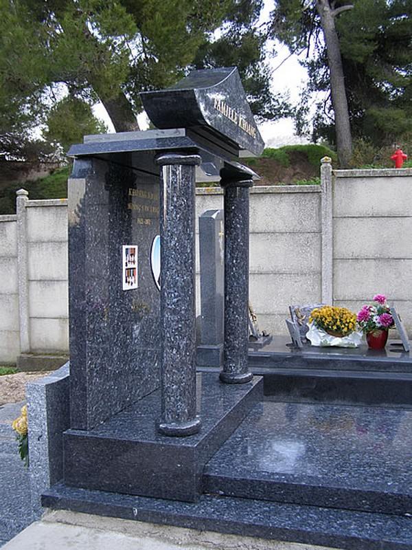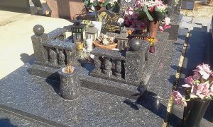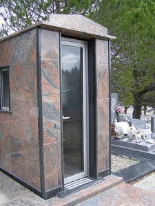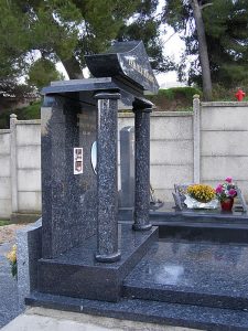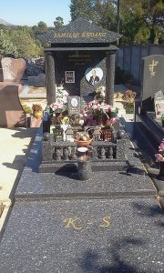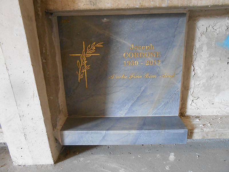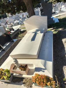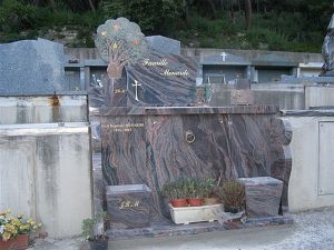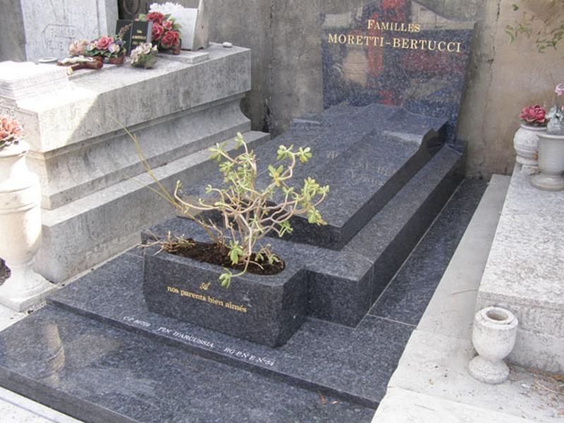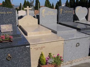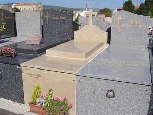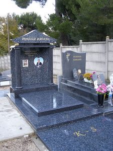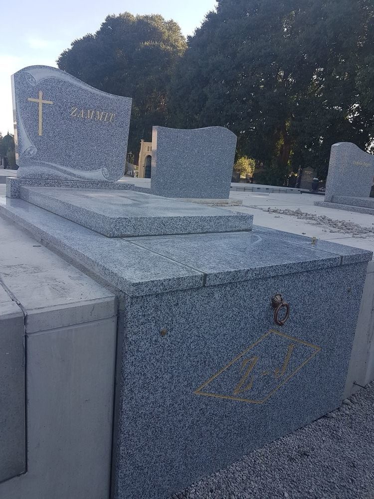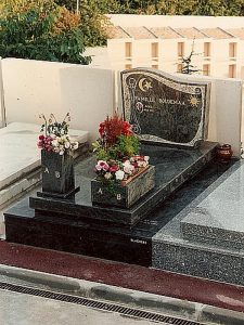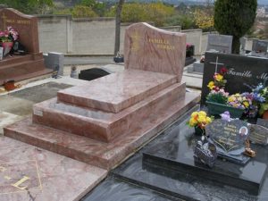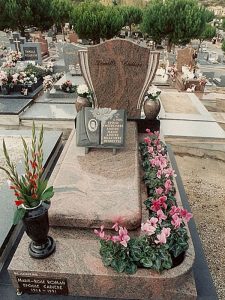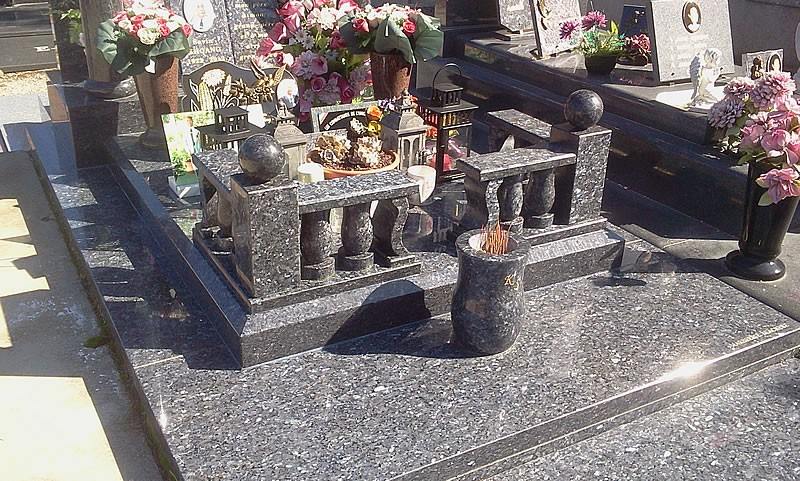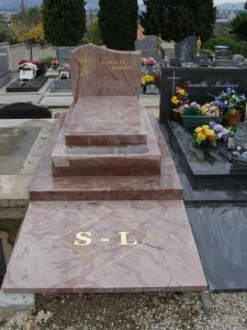 Habillage d’un caveau en élévation, en granit Tifany, les bacs à fleur sont en marbrerie assemblée collée.