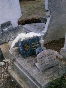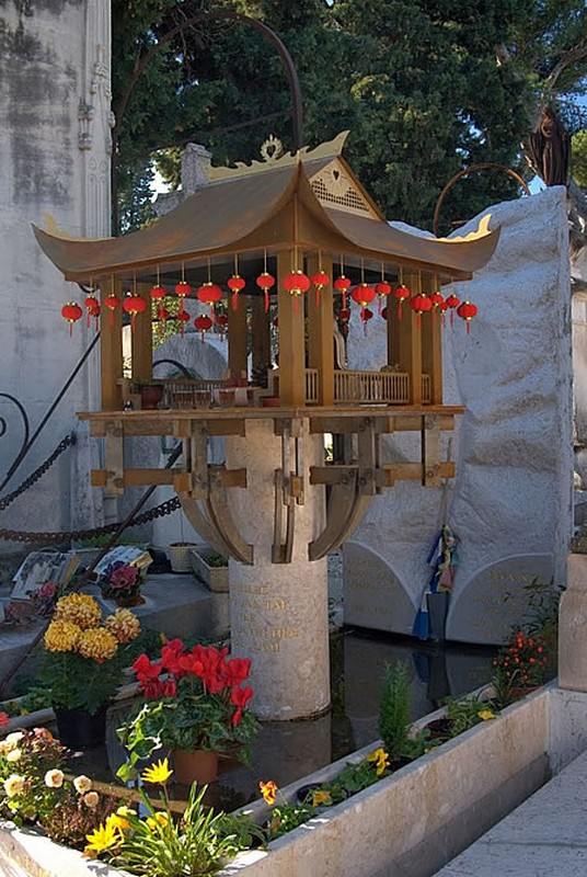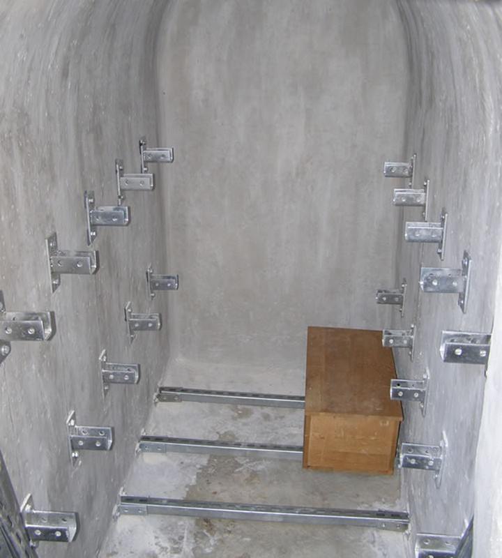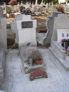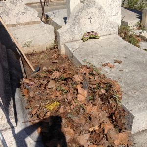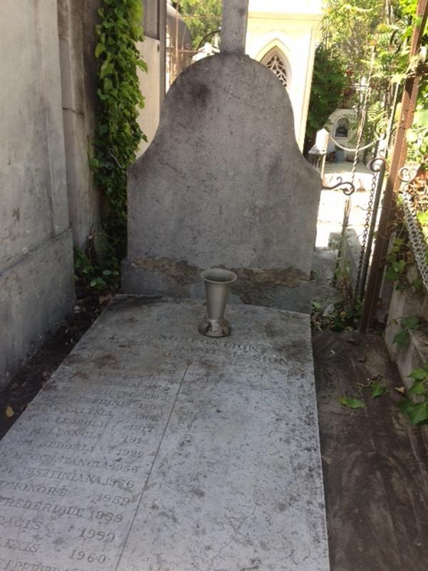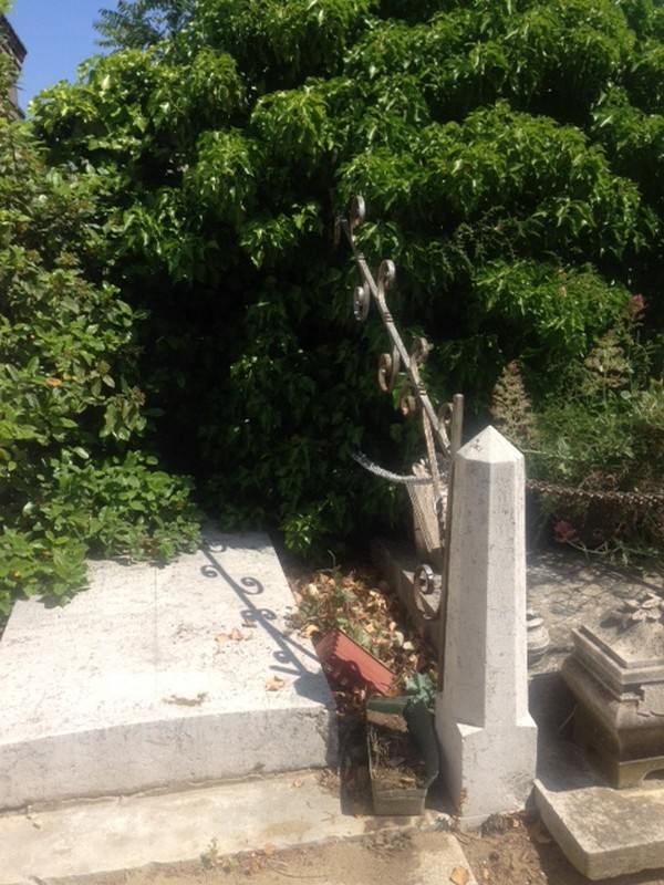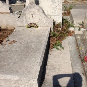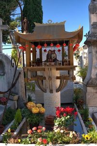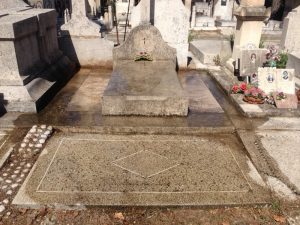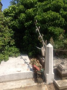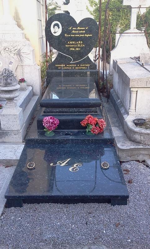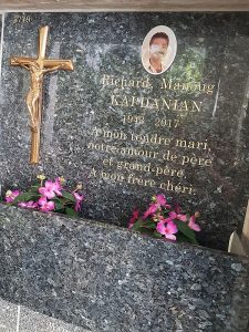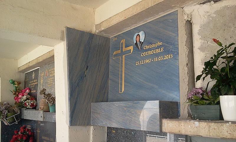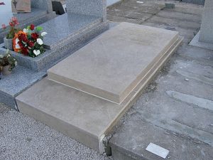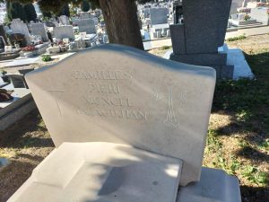 Habillage d’un caveau en élévation, en granit Tifany, les bacs à fleur sont en marbrerie assemblée collée.
