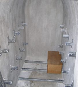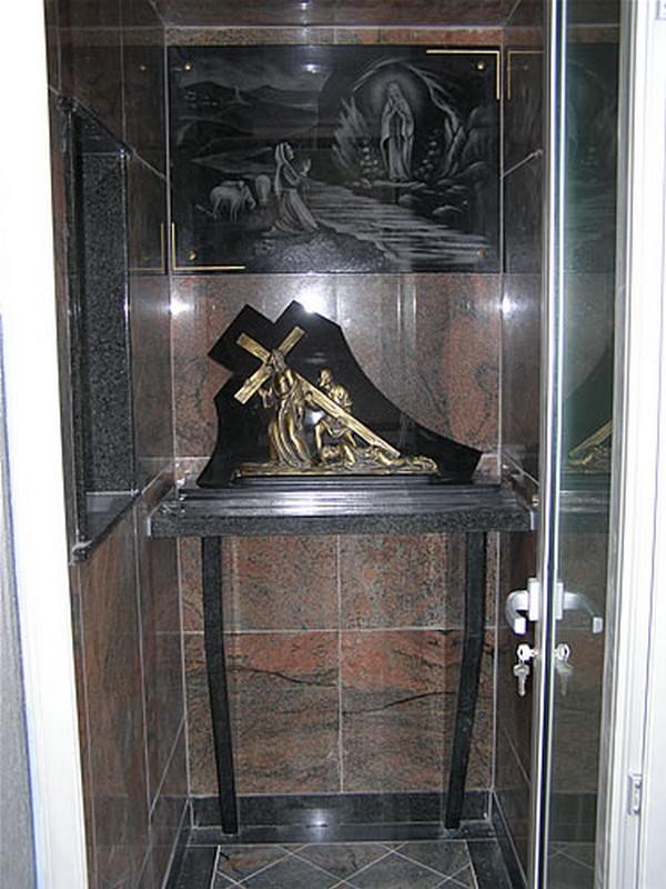 Habillage cal pinée d’une chapelle en granit « FLAMINGO » , avec ses baguettes d’angles et seuil en granit noir d’AFRIQUE.